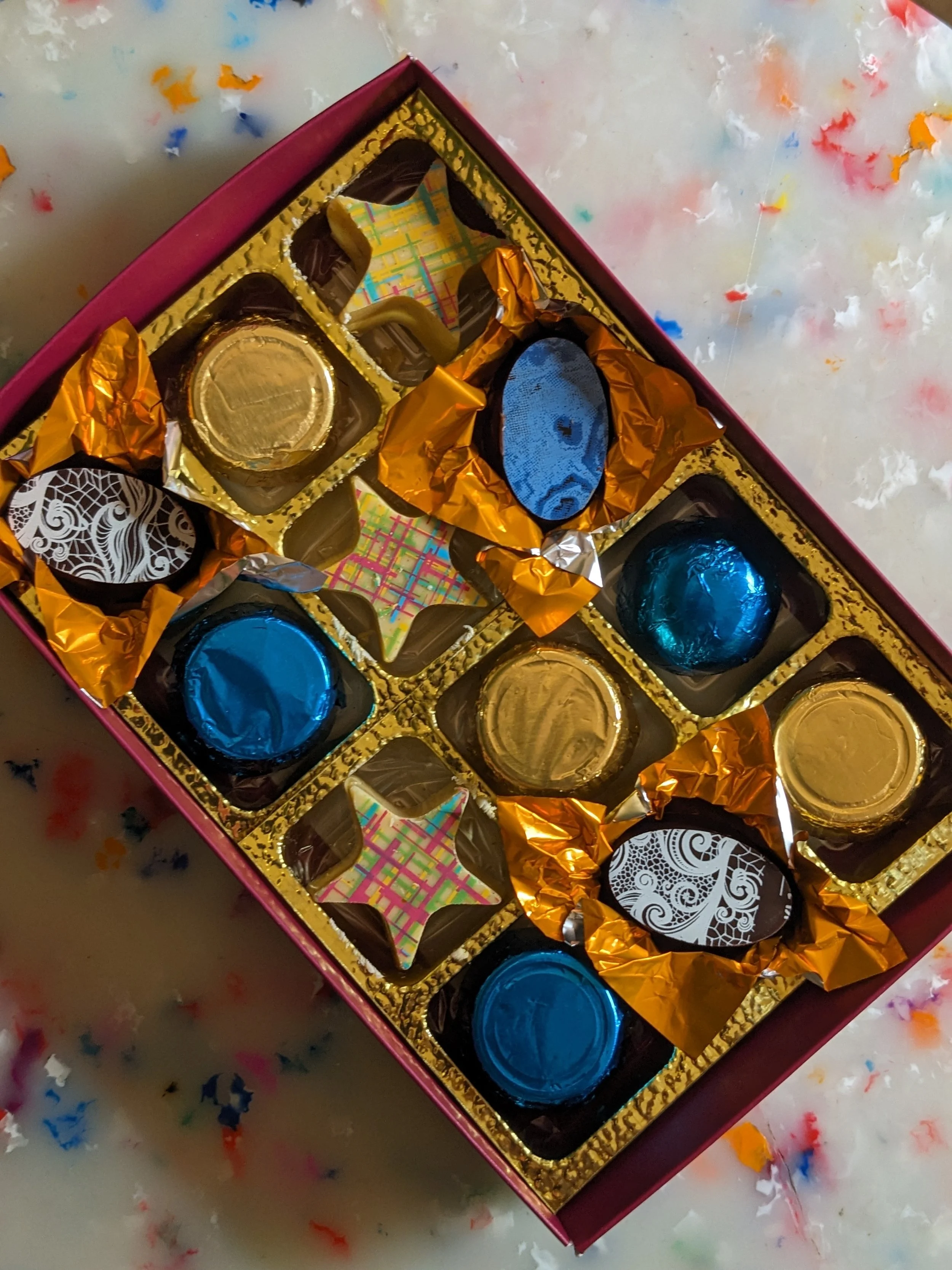 Here there is a small snapshot of our chocolate selection plus lots of lovely presents of pin badges, tote bags and jigsaws. We only ship UK wide - orders can take up to 10 days to arrive from purchase.