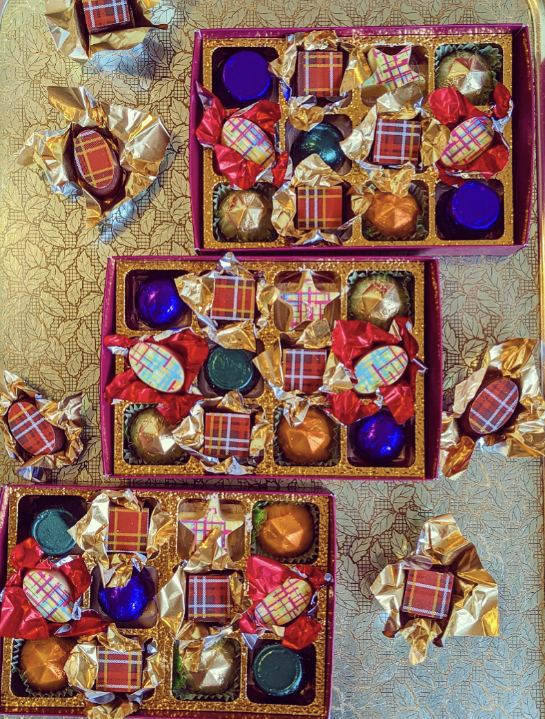 Tartan Whisky Caramels /// Zingy Sea Buckthorn fondant in Dark Chocolate /// White Chocolate Lemongrass and Ginger/// Honey Milk Chocolate with Toasted Hazelnuts/// Almond Dark Chocolate with Amaretto soaked Prunes ///Pistachio Jewels